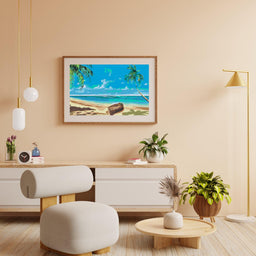 Heeft de muur geen bank, kast of tafel ervoor? Kies dan voor een kunstwerk van minimaal 80 cm hoog, zodat het niet wegvalt in de ruimte en echt impact maakt.